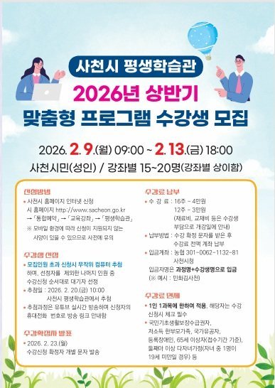 [한국Q뉴스] 사천시 평생학습관이 2026년 상반기 맞춤형 프로그램 수강생을 2월 9일부터 13일까지 모집한다고 3일 밝혔다.