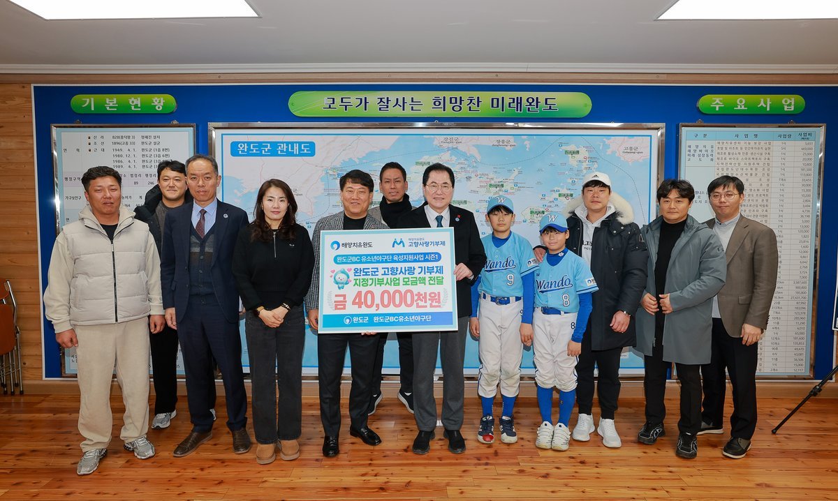 [한국Q뉴스] 완도군은 지난 29일 '완도군 BC유소년 야구단'의 선수, 관계자, 학부모 등을 초청해 고향사랑기부제 지정 기부금 4천만원을 전달했다.