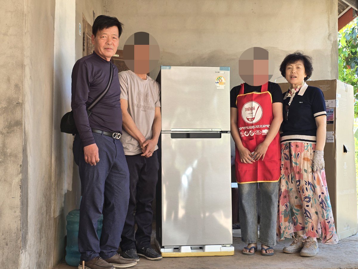 법인 백성규 대표와 임원들은 지난 22일 라오스 현지에서 외국인 계절근로자 두 가구에 각각 냉장고 1대와 김 세트를 전달하고 반가움을 나눴다.