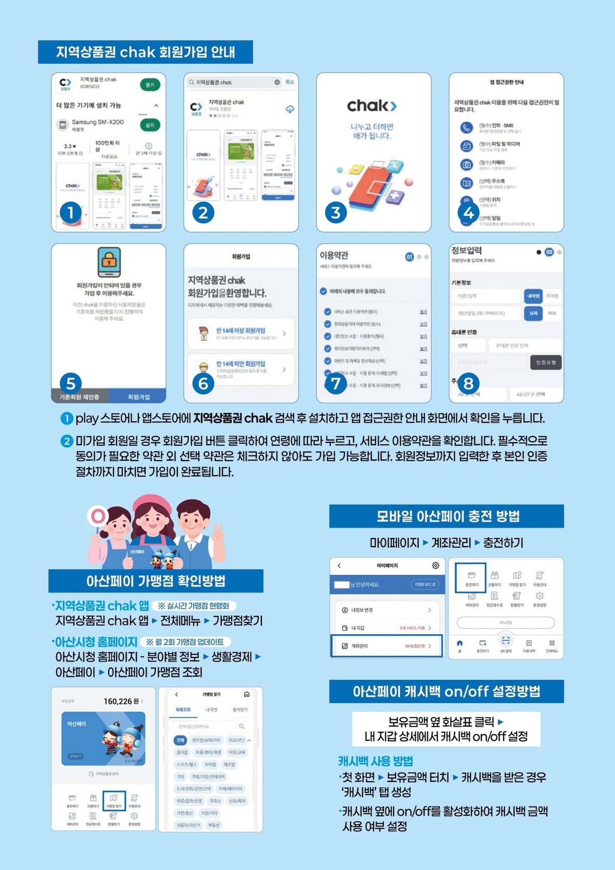 특히 모바일 아산페이는 14세 이상 전국민 누구나 사용 가능하며 CHAK 앱 설치부터 충전, 결제까지 약 5분 이내로 간편하게 이용할 수 있다.