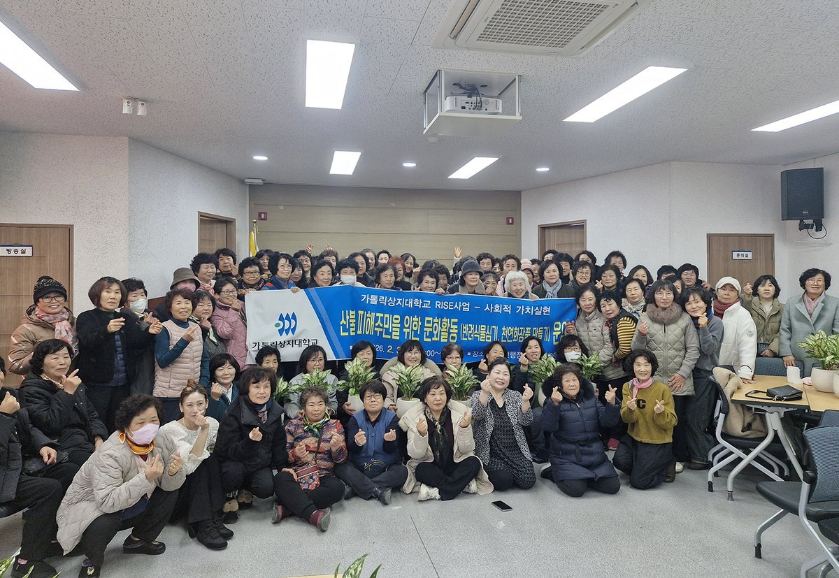 [한국Q뉴스] 가톨릭 상지대학교 RISE 사업단과 피움교육문화컨설팅은 2월 3일 임하면 복지회관에서 산불피해지역 이재민 100여명을 대상으로 웃음치료 및 문화생활 프로그램을 진행했다.