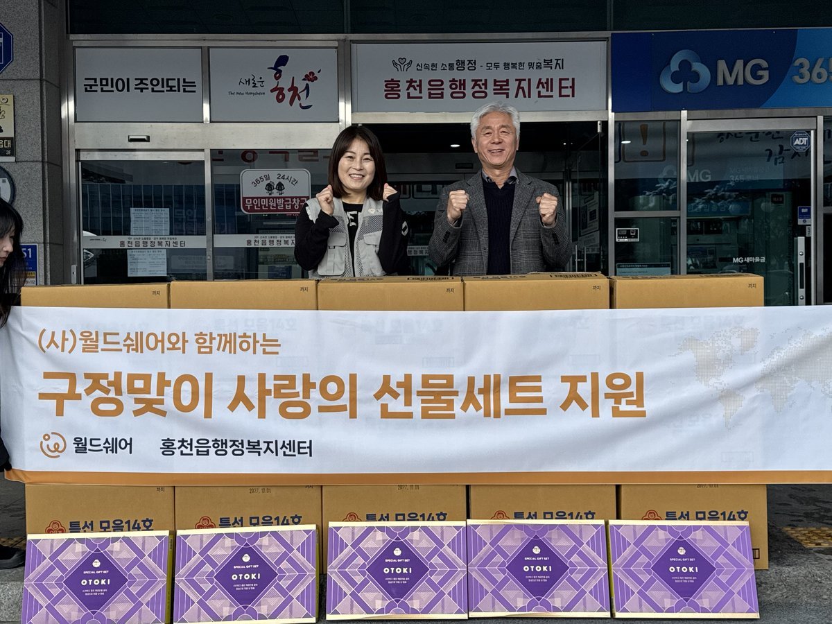 [한국Q뉴스] 사단법인 월드쉐어는 2월 2일 홍천읍 행정복지센터를 방문해 오뚜기 설 명절 선물세트 150개를 기탁했다.