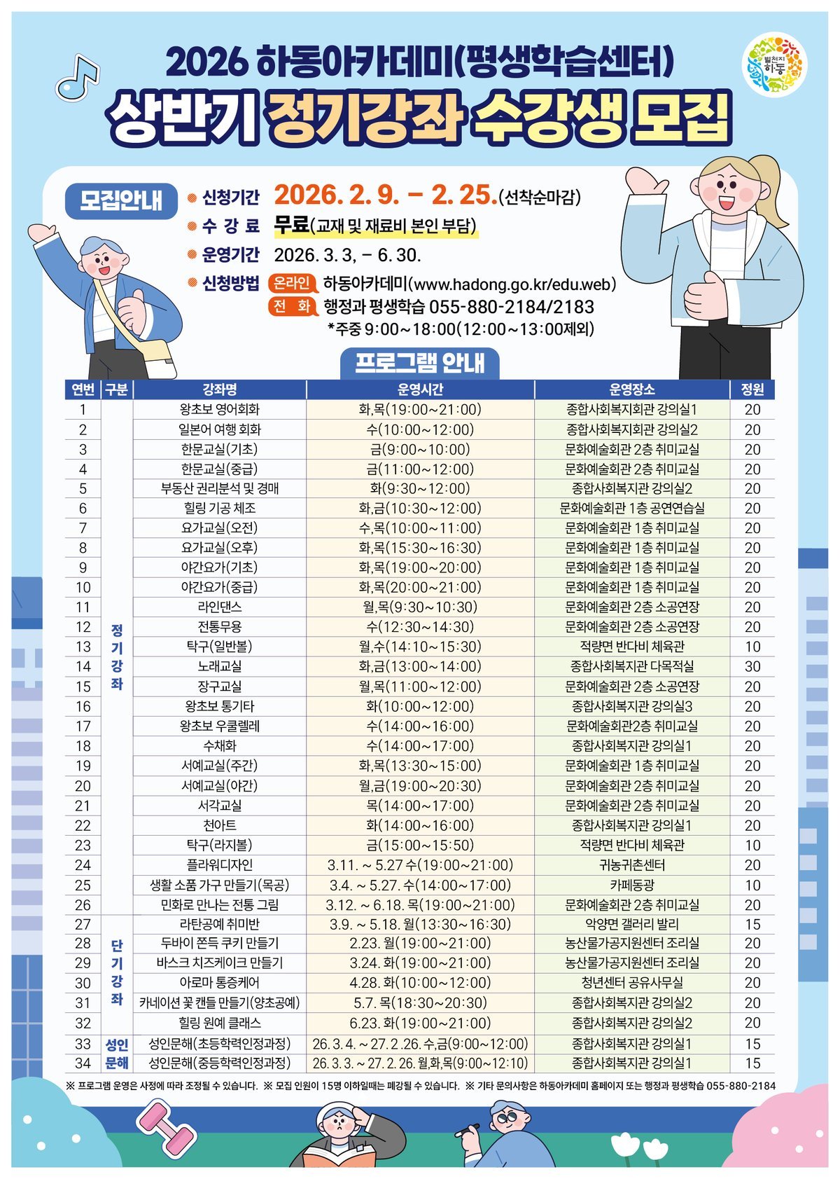 이번 상반기 하동아카데미는 총 32강좌를 운영하며 군민의 다양한 학습 수요를 반영해 자격·취미·교양·건강·문화예술 분야 등으로 폭넓게 구성했다.