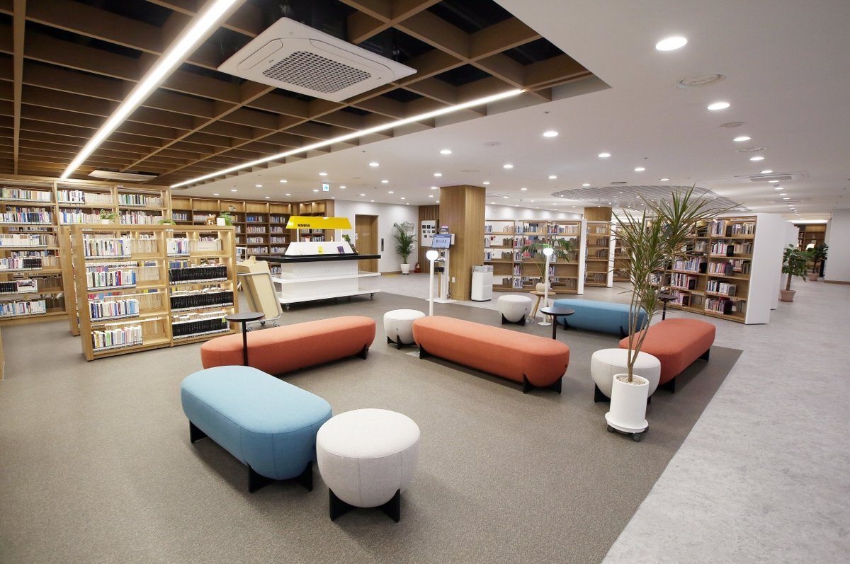 특히 기존의 높은 밀집 서가로 인해 좁고 어두운 공간을 개방형의 낮은 서가와 세련된 테이블·소파 등을 배치해 개선하고 여기에 격자 천장·조명 시공을 더해 밝고 현대적인 분위기의 도서관으로 탈바꿈시켰다.
