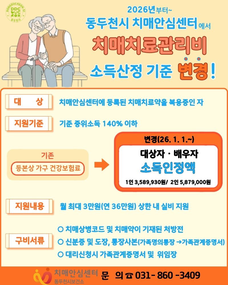 [한국Q뉴스] 동두천시 치매안심센터는 2026년 1월 1일부터 치매치료관리비 지원사업의 소득 산정 기준이 변경된다고 3일 밝혔다.