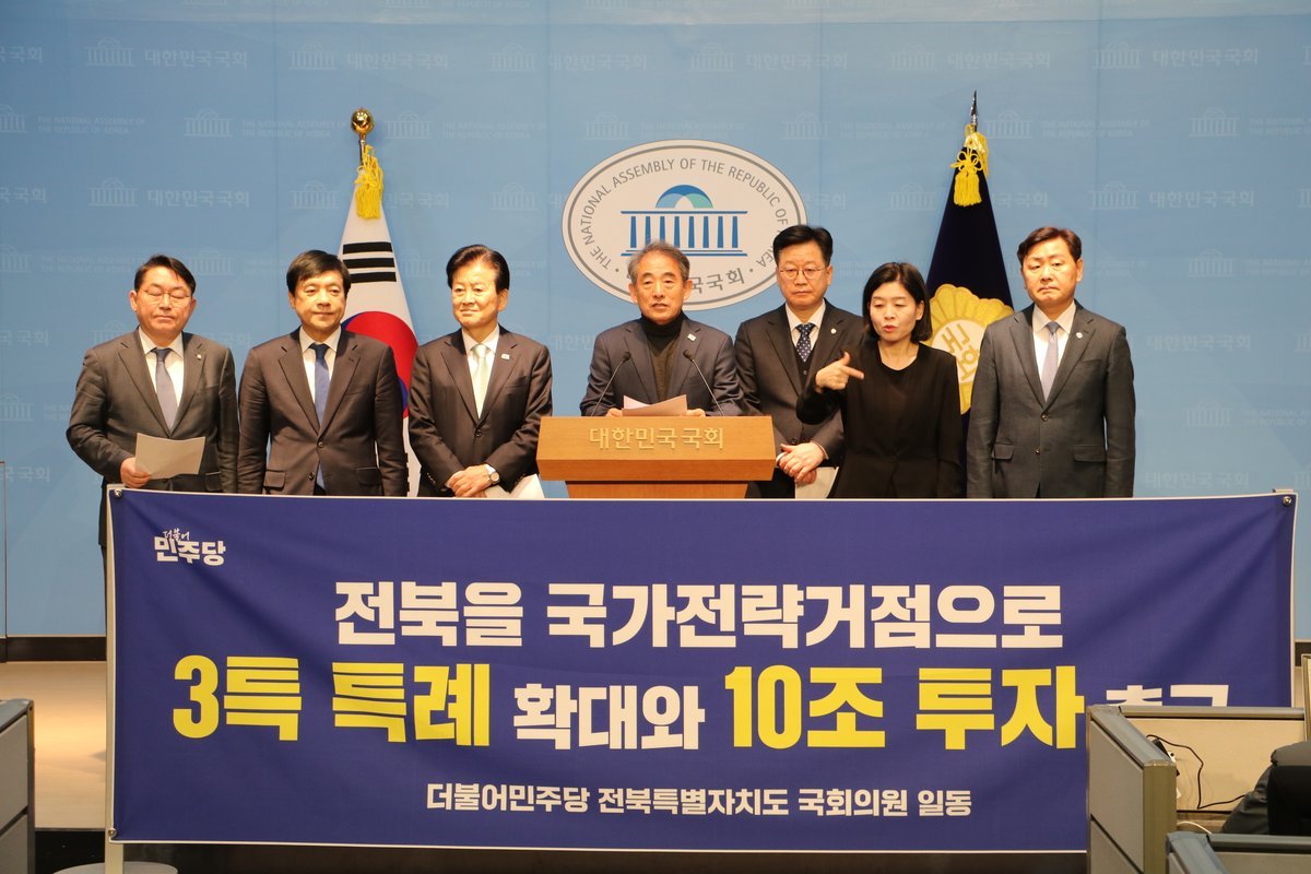의원들은 "전북은 '5극에 밀리는 3특'이 아니라 5극보다 더 강력한 지위와 특례를 보장받아야 할 지역"이라고 강조하며 최근 국회에서 신속하게 논의 중인 5극 관련 법안과의 구조적 격차를 조속히 해소해야 한다고 밝혔다.