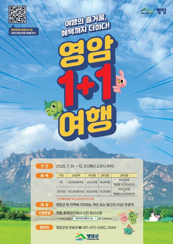 이러한 성과를 바탕으로 영암군은 올해부터 영암여행 1+1을 확대 추진한다. 참여 기준을 현실화하고 인센티브 지급 구조를 개선해 개인·단체 관광객의 참여를 높이고, 재방문을 더 쉽게 한다는 방침이다.