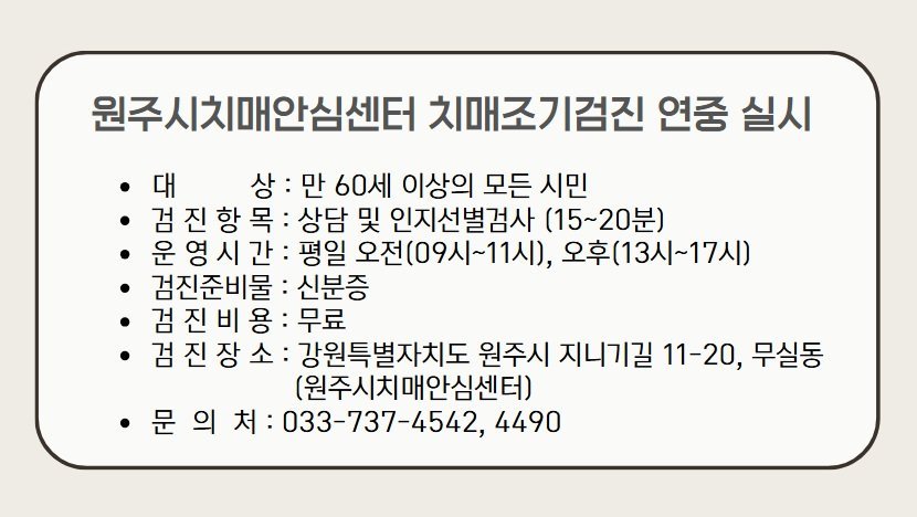 [한국Q뉴스] 원주시치매안심센터는 치매 조기 발견과 적기 치료를 위해 지역 내 60세 이상 주민을 대상으로 치매 조기 검진 사업을 연중 실시하고 있다.