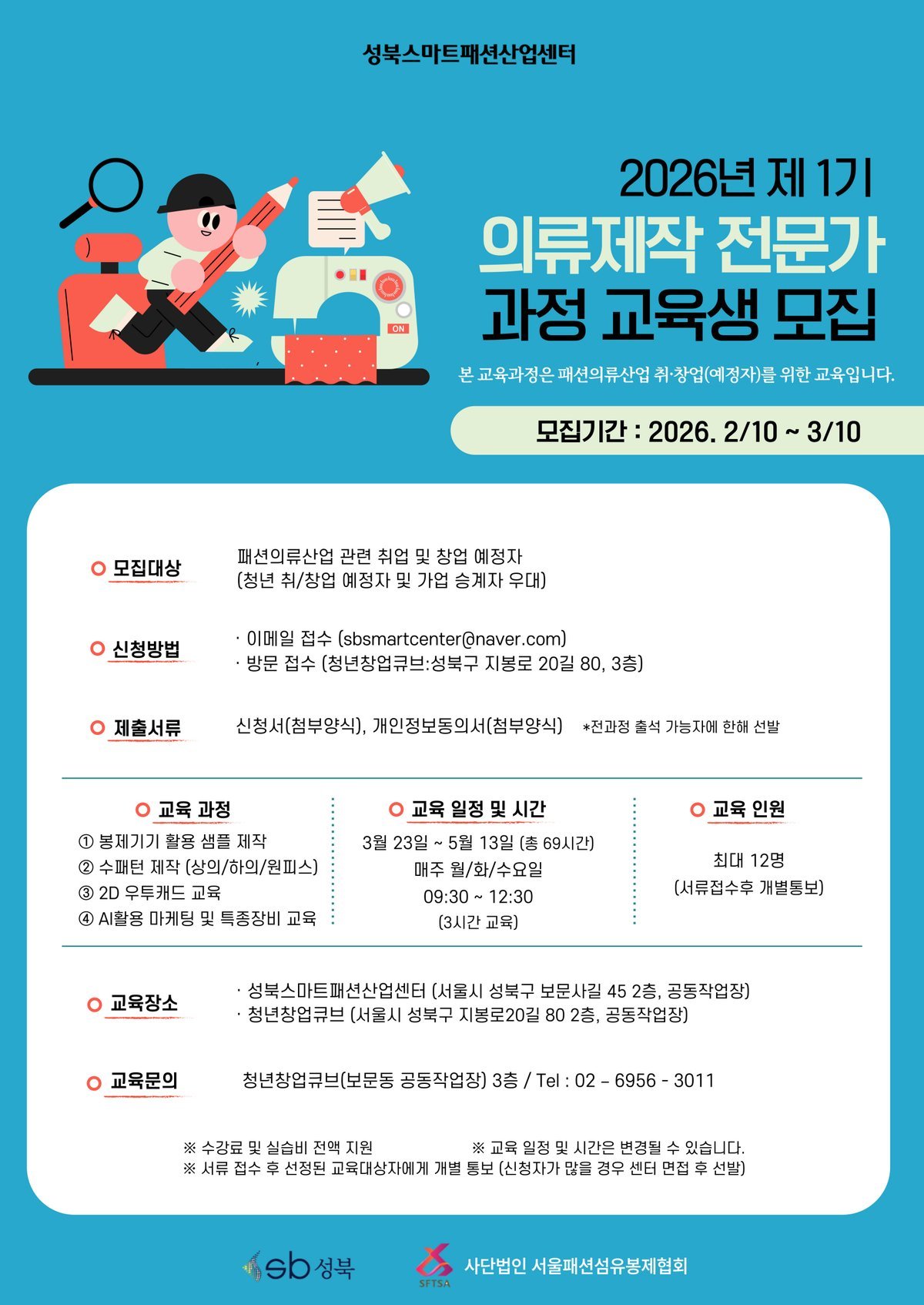 [한국Q뉴스] 서울 성북구가 서울패션섬유봉제협회에 위탁 운영 중인 성북스마트패션산업센터에서 2026년 제1기 의류제작 전문가과정 교육생을 모집한다.