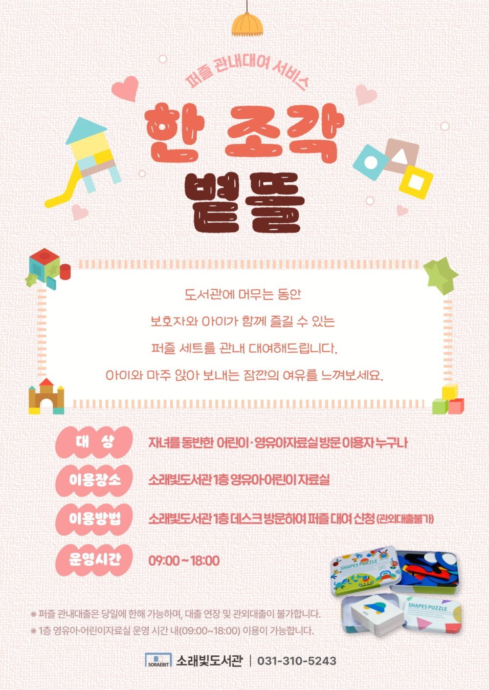 김혜순 소래빛도서관장은 “‘한 조각 볕뜰’은 아이들이 한자리에 머물며 차분히 몰입할 수 있는 시간을 제공하고자 기획한 서비스”라며, “부모와 아이가 함께 퍼즐을 맞추며 도서관에서의 경험이 더 깊어지길 기대한다”라고 말했다.