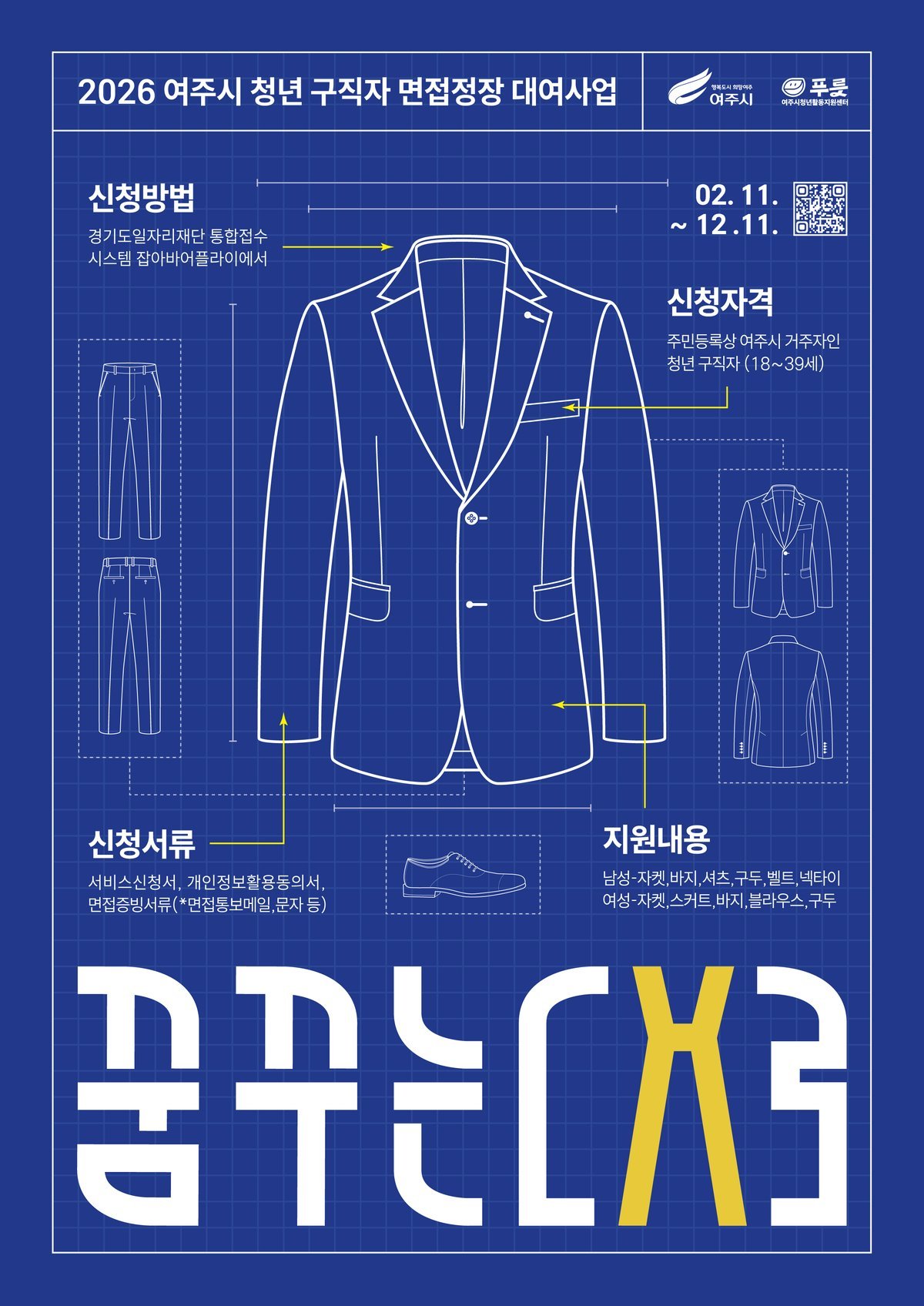 여주시 '꿈꾸는대로'면접정장 대여사업은 청년 실업률 증가 및 구직활동기간 장기화에 따른 청년들의 경제적 부담 해소에 기여하고자 2021년도부터 6년째 지속하고 있는 구직활동촉진 사업의 일환으로 18세~39세 청년이면 누구나 신청 가능하며 사업기간동안 ~ 12. 11. 예산소진시까지) 무료로 서비스를 이용할 수 있다.