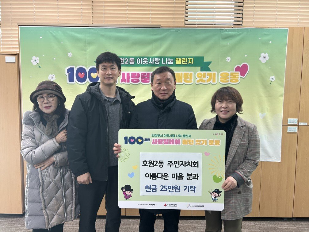 [한국Q뉴스] 의정부시 호원2동주민센터는 지난해 12월부터 올해 2월까지 호원2동 주민자치회 회장 김규오, 부회장 이영배를 비롯한 아름다운 마을·스마트한 마을·살기 좋은 마을 분과가 지역 내 어려운 이웃을 돕기 위해 성금 50만 원, 쌀 50kg, 컵라면 10상자, 쌀국수 200인분, 사과즙 30박스를 기탁했다고 밝혔다.