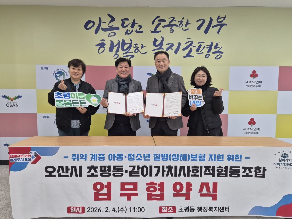 [한국Q뉴스] 오산시 초평동 행정복지센터는 지난 4일 지역 내 차상위계층 청소년과 아동의 건강한 성장 지원과 의료비 부담 완화를 위해 같이가치사회적협동조합과 질병보험료 지원을 위한 업무협약을 체결했다고 밝혔다.
