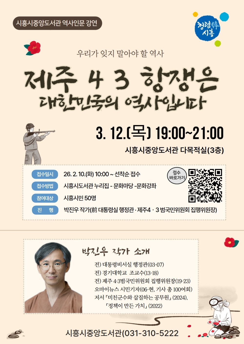 [한국Q뉴스] 시흥시중앙도서관은 오는 3월 12일 오후 7시, 시민을 대상으로 역사 인문 강연 ‘제주 4ㆍ3항쟁은 대한민국의 역사입니다’를 운영한다.
