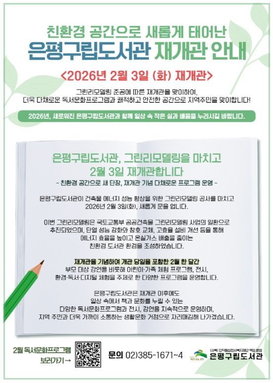 은평구립도서관은 재개관을 기념해 2월 한 달간 어린이와 가족을 대상으로 한 다양한 프로그램도 운영한다.