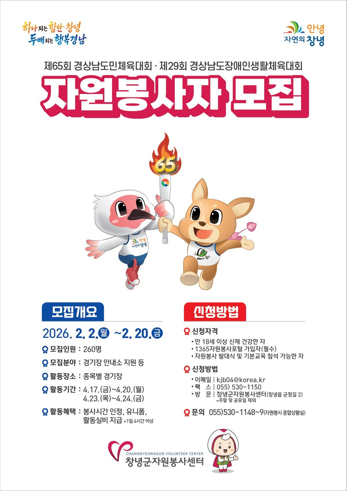 [한국Q뉴스] 창녕군은 오는 4월 17일부터 20일까지 열리는 제65회 경상남도민체육대회와 4월 23일 24일 진행되는 제29회 경상남도장애인생활체육대회의 성공적인 개최를 위해 자원봉사자 260명을 모집한다.