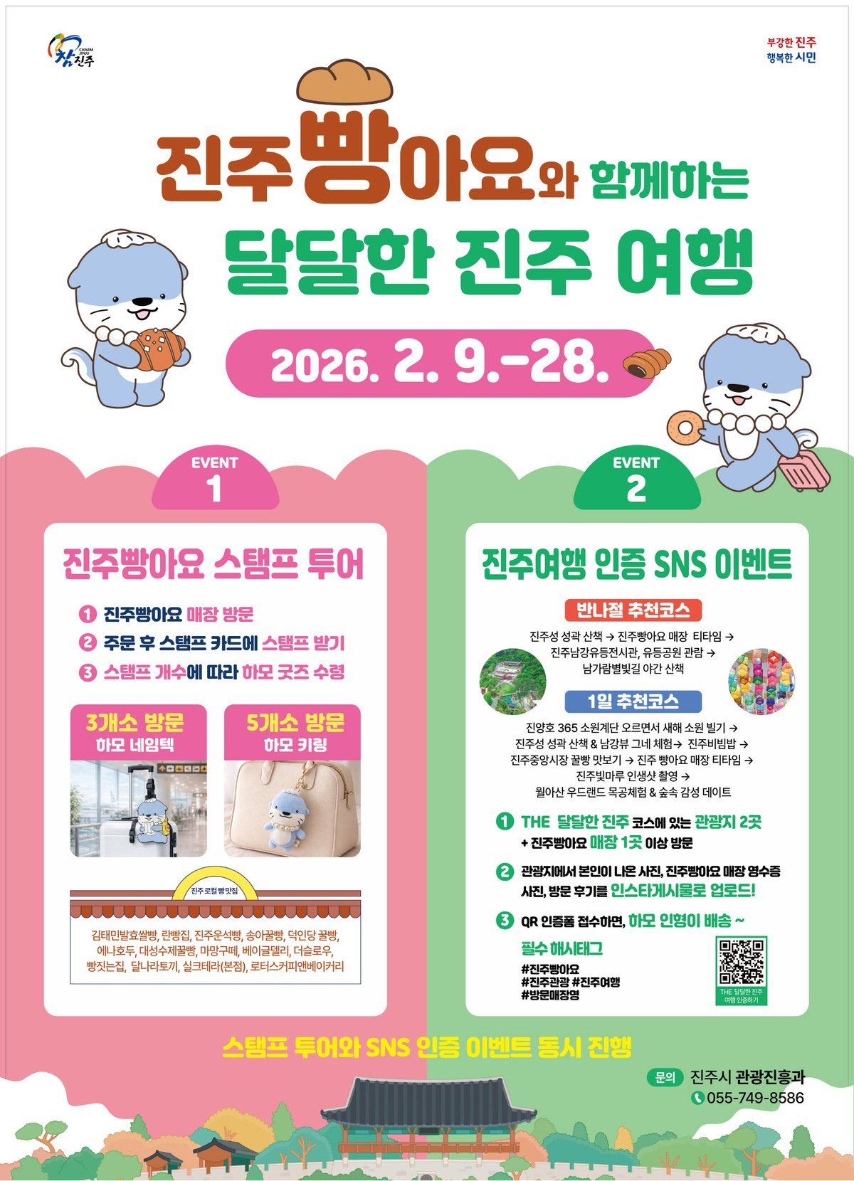 이와 함께 밸런타인데이와 설 연휴 시즌에 맞춰 진주 주요 관광지와 ‘진주빵아요’매장을 연계한 ‘반나절·1일’여행코스를 제안하고 해당 코스를 따라 방문한 관광객을 대상으로 SNS 방문 인증 이벤트도 함께 운영한다.