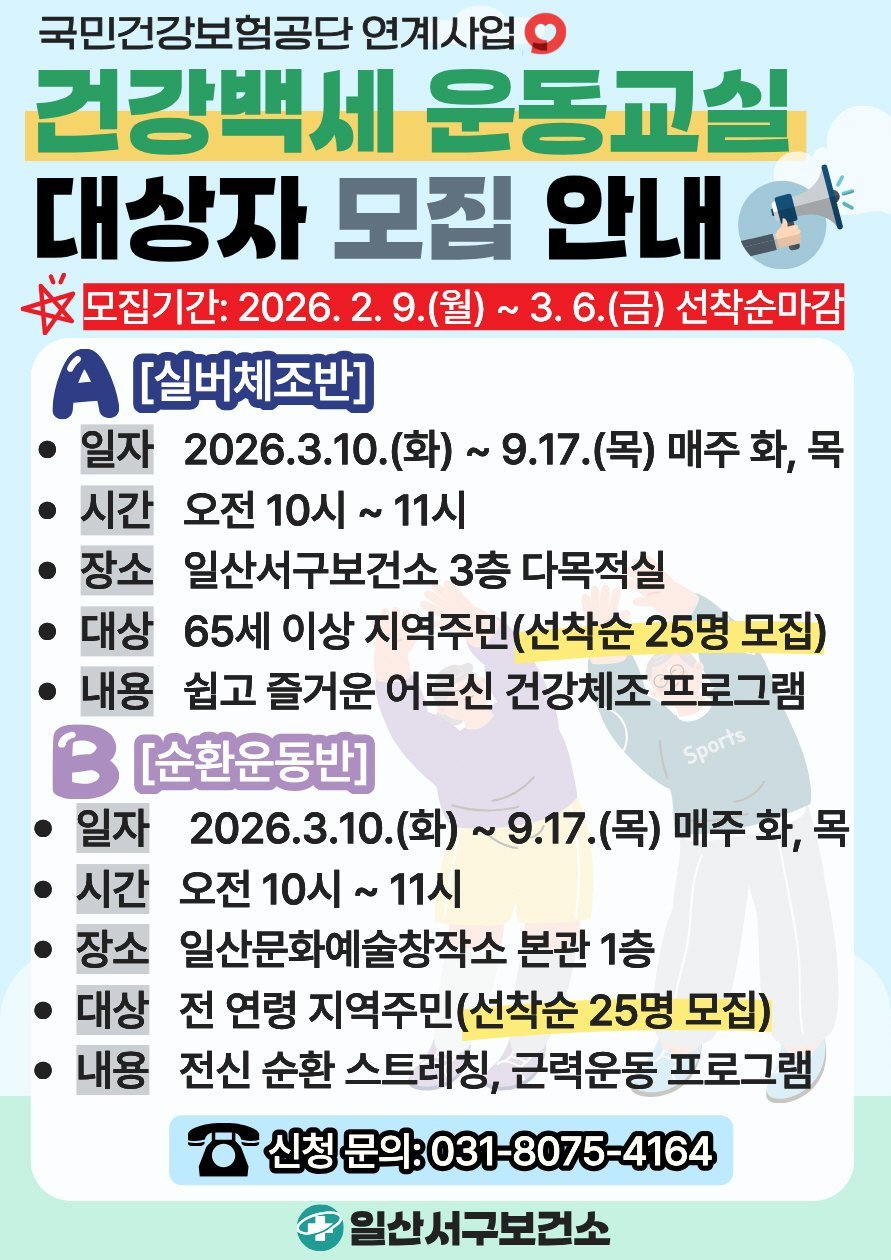실버체조반은 65세 이상 어르신을 대상으로 일산서구보건소에서 순환운동반은 전 연령층을 대상으로 일산문화예술창작소에서 각각 운영될 예정이다.