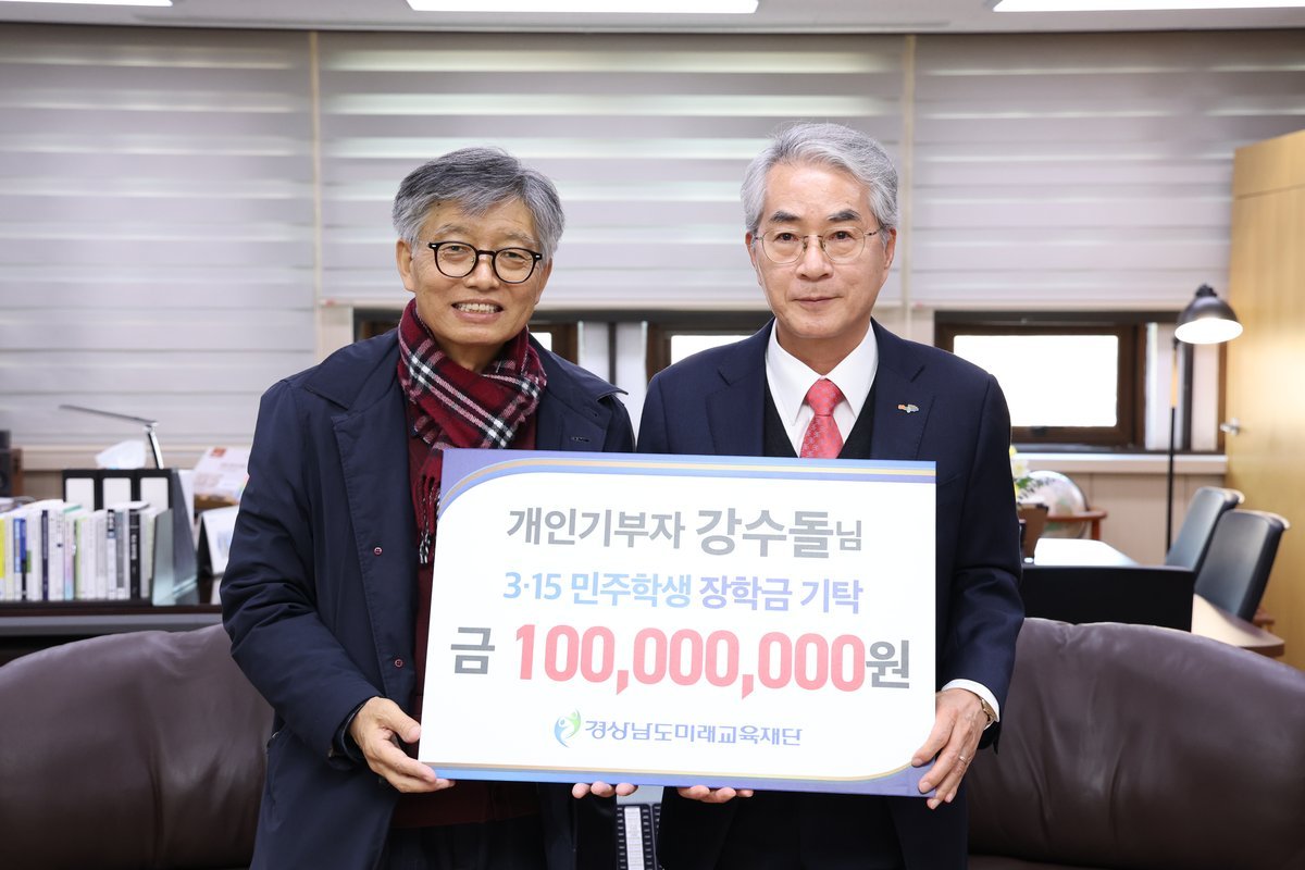 [한국Q뉴스] 경상남도미래교육재단은 강수돌 고려대학교 명예교수가 3.15 민주 정신을 계승하는 데 써달라며 장학금 1억원을 기탁하자, 9일 오후 3시 30분에 교육감 집무실에서 기탁식을 열어 감사의 마음을 전했다.