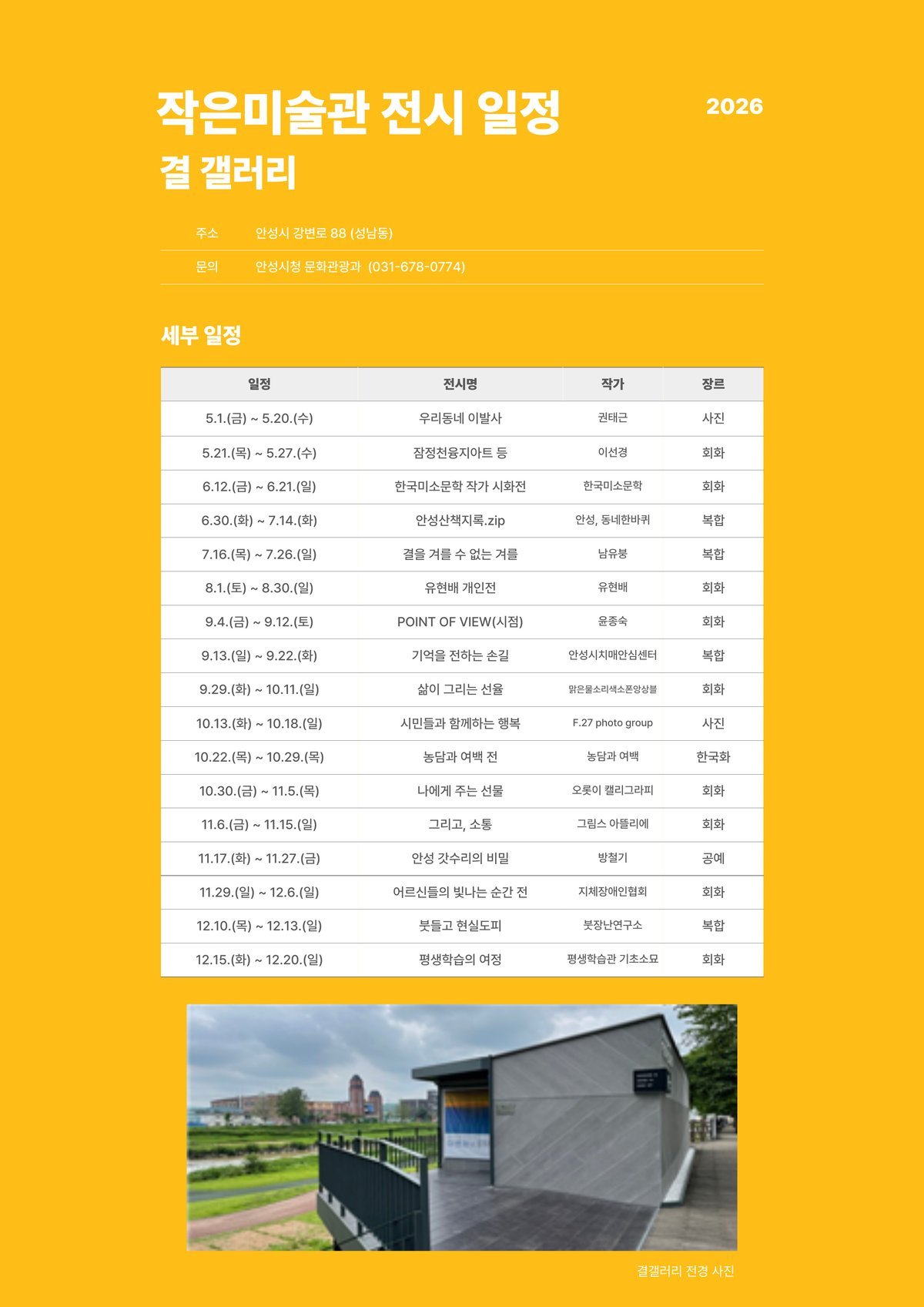 [한국Q뉴스] 안성시는 2월 9일 ‘안성시 작은미술관 전시 공모’ 심사 결과를 발표하고, 총 31개의 전시를 최종 선정했다고 밝혔다.
