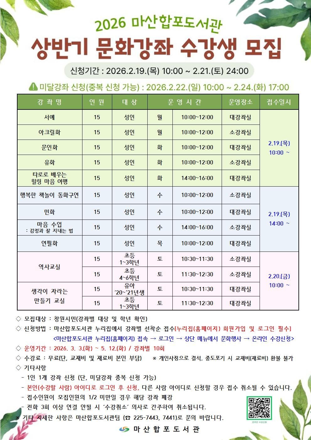 [한국Q뉴스] 창원특례시 마산합포도서관에서는 시민들에게 다양한 평생학습 기회를 제공하고자 '2026년 상반기 문화강좌'수강생을 2월 19일부터 2월 24일까지 마산합포도서관 누리집에서 온라인으로 모집한다.