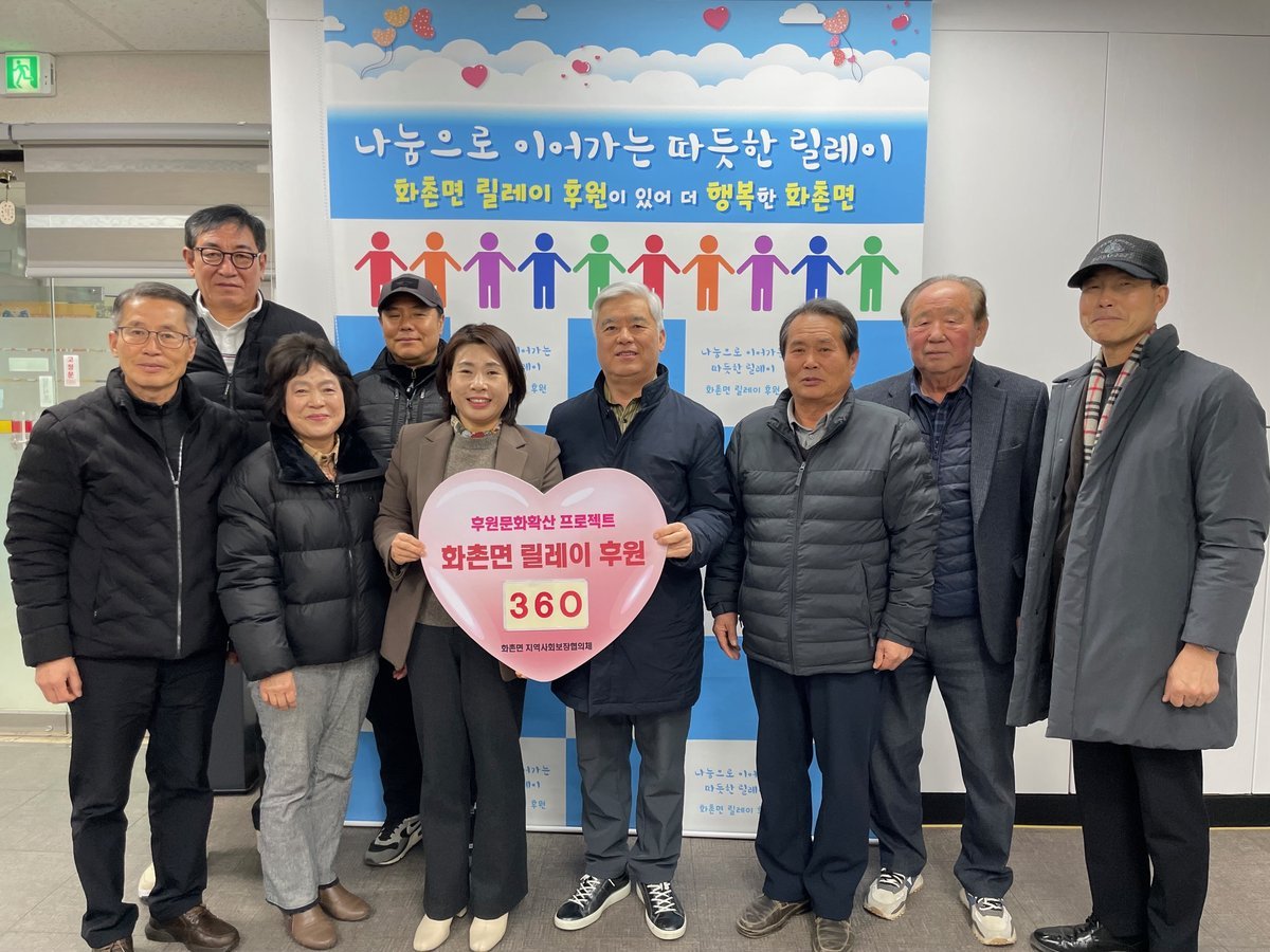 한편 화촌면 릴레이 후원은 지역 기관 단체와 주민들의 자발적인 참여로 이어지고 있으며 모은 후원금과 물품은 관내 취약계층 지원과 복지 증진을 위해 사용되고 있다.