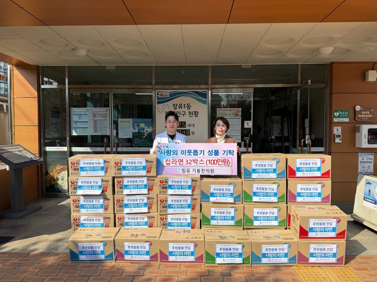 [한국Q뉴스] 김해시 장유1동은 장유 기통찬의원에서 명절을 맞아 라면 100만원 상당을 기탁했다고 12일 밝혔다.