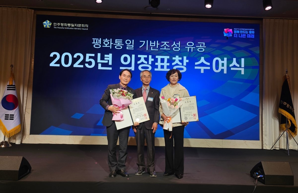 [한국Q뉴스] 민주평통 문경시협의회 천금선 부회장과 박인국 자문위원은 11일 안동 스탠포드호텔에서 열린 ‘2025년 민주평화통일자문회의 표창 수여식’에서 의장 표창을 수상했다.