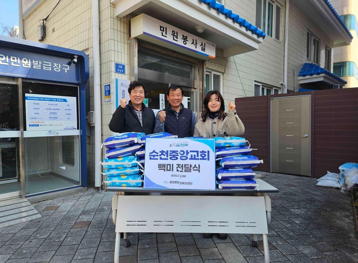 김종환 중앙동장은 “매년 잊지 않고 따뜻한 나눔을 실천해 주시는 순천중앙교회에 깊이 감사드린다”며 “기탁해 주신 백미는 겨울철 복지사각지대에 있는 가정에 정성껏 전달하겠다”고 전했다 순천중앙교회는 매년 꾸준한 나눔 활동을 이어오고 있으며 2026년에는 300포 이상의 백미를 모금해 중앙동을 비롯해 향동, 매곡동 행정복지센터, 지역아동센터 등 순천 각지에 전달하는 등 지역사회 나눔문화 확산에 앞장서고 있다.