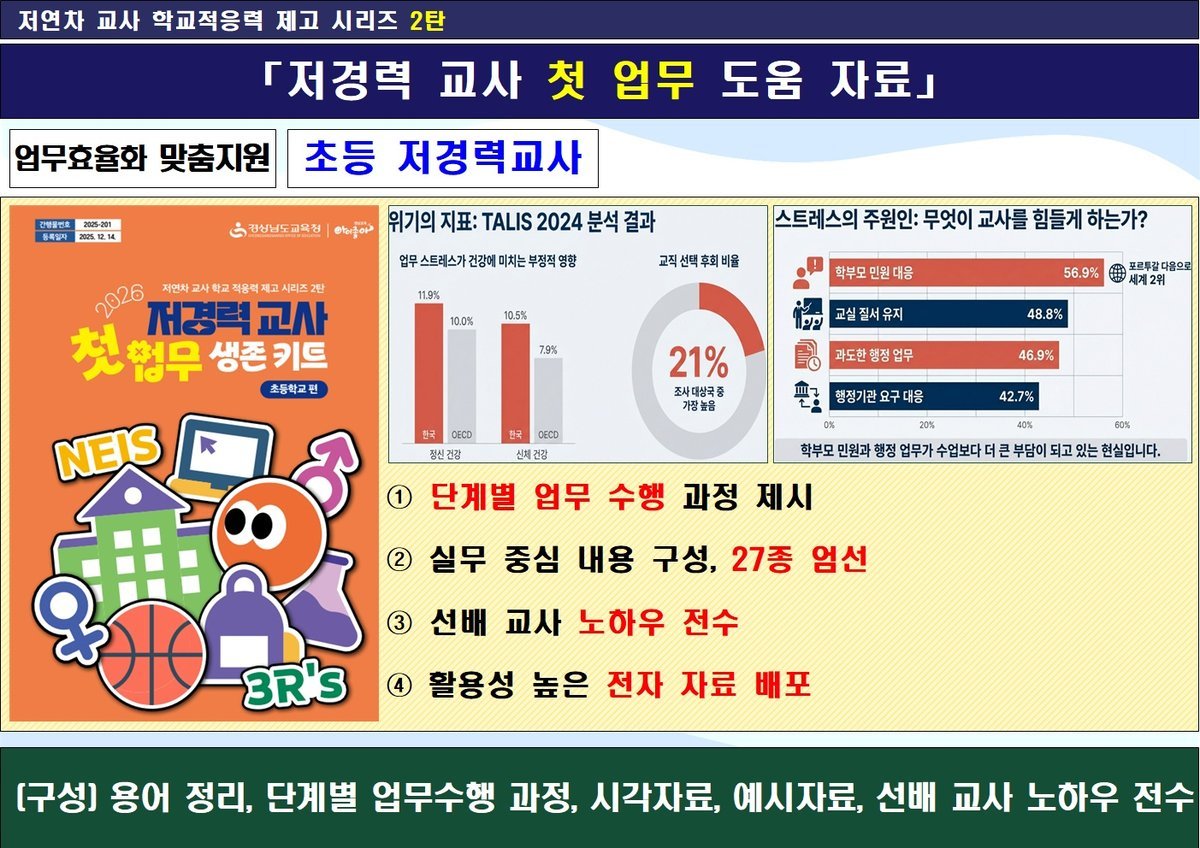 [한국Q뉴스] 경상남도교육청은 도내 전 초등학교를 대상으로 저경력 교사의 안정적인 학교 적응을 지원하기 위한 '2026 저경력 교사 첫 업무 도움 자료'을 제작해 배포한다.